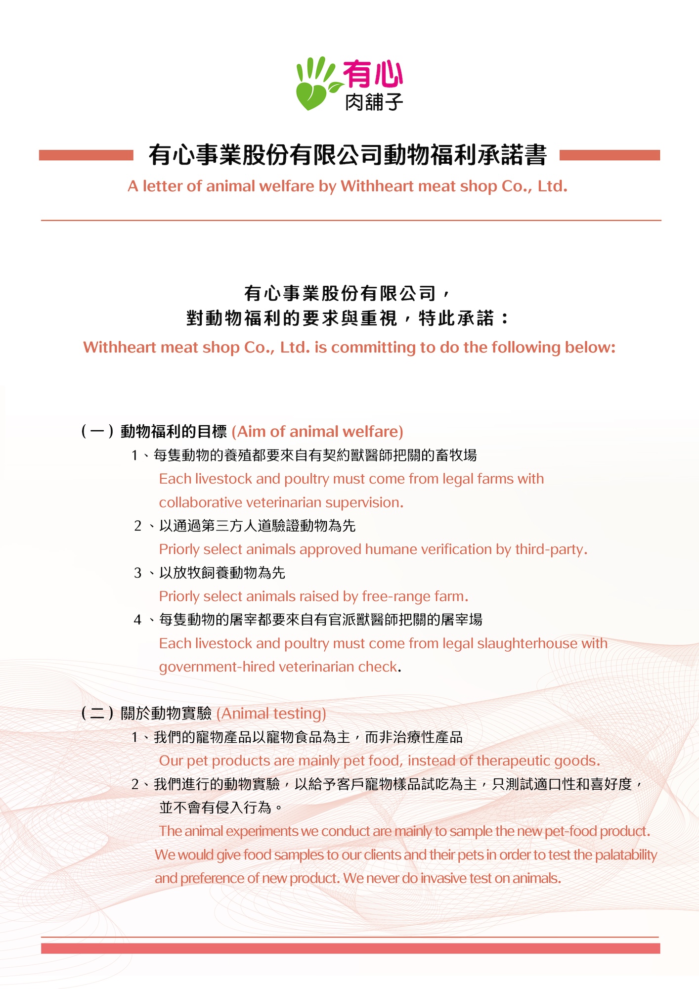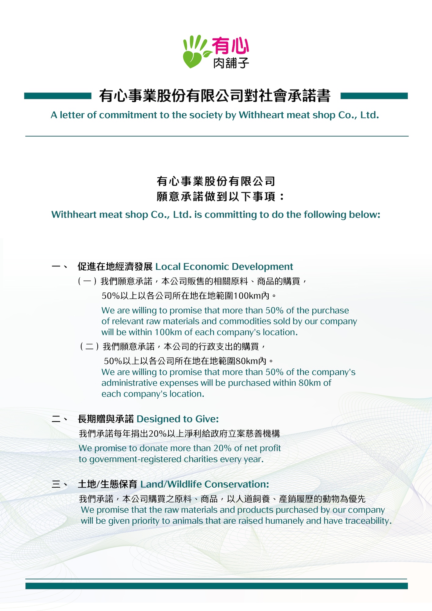 「有心肉舖子」致力於動物的人道對待,從快樂生長到人道屠宰。創立「有心溯源平台」,提供餐廳合法產銷履歷食材及追溯來源,計算碳足跡,因而獲農委會「產銷履歷卓越貢獻獎」。有心秉持著「以人為尊」的中心思想,隨時替農民、消費者、你跟我著想,我們協助願意作「真」的農民,以提供國人「好」的食物,請您用購買支持我們的理念,改變,從你我開始!